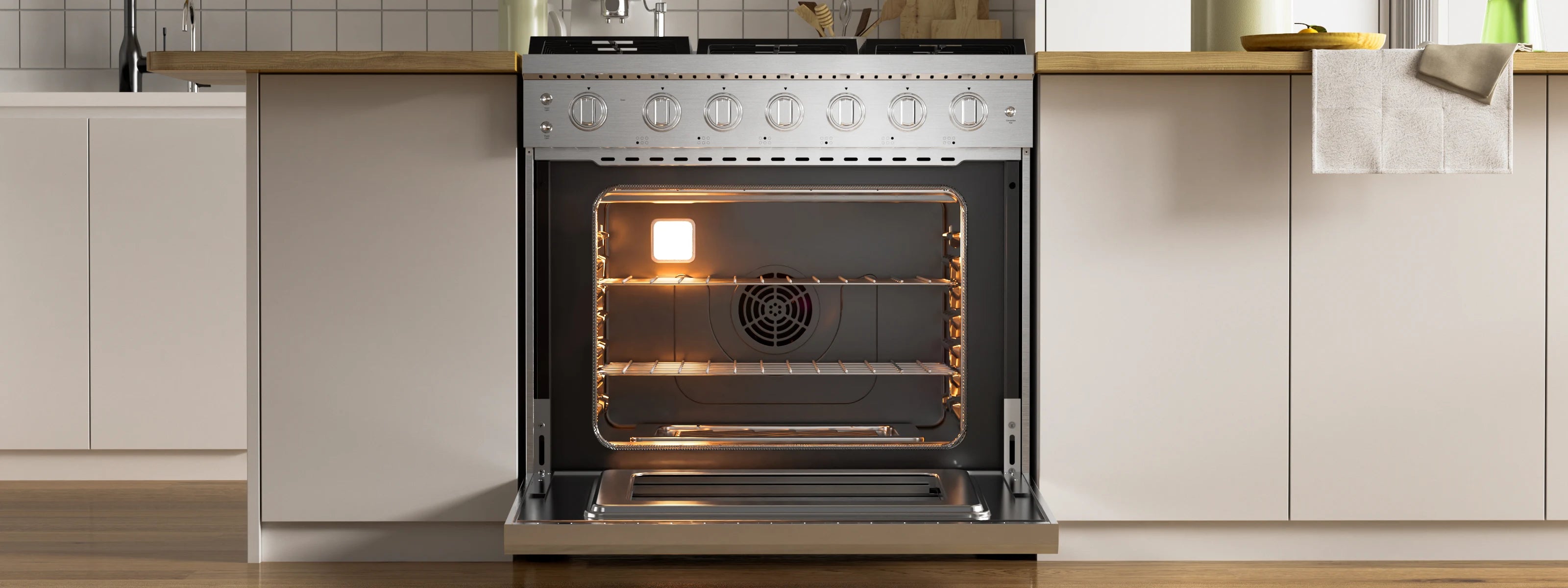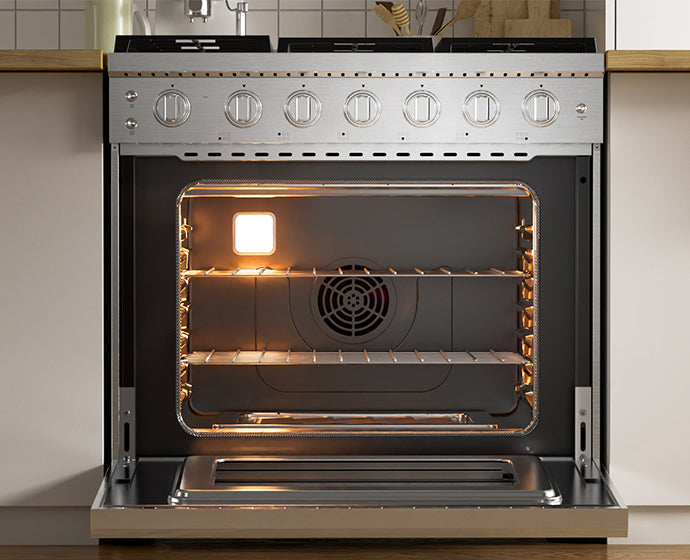 All ovens have a thicker door with a Low-E heat-insulation membrane and a door gap seal to prevent accidental heat scalding.