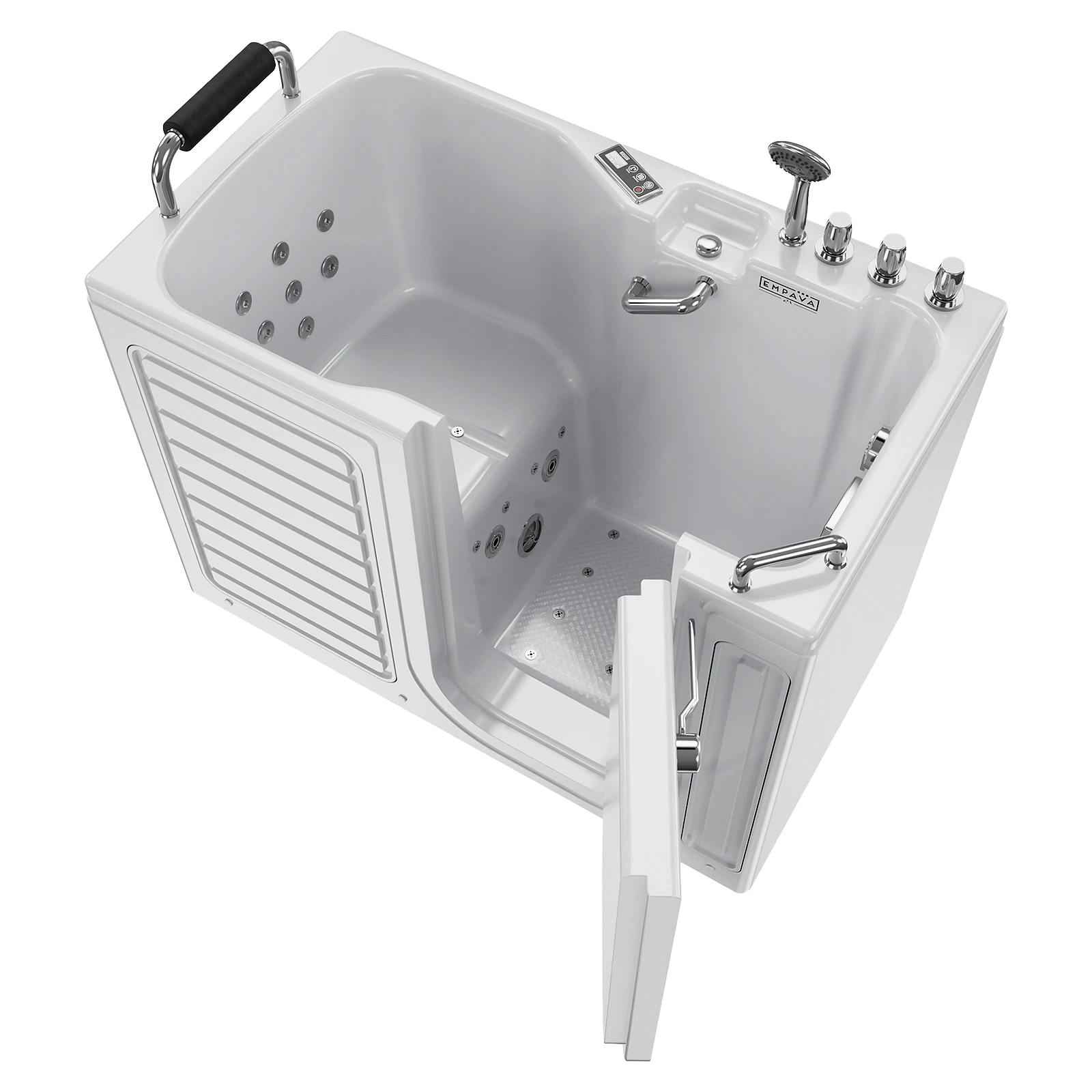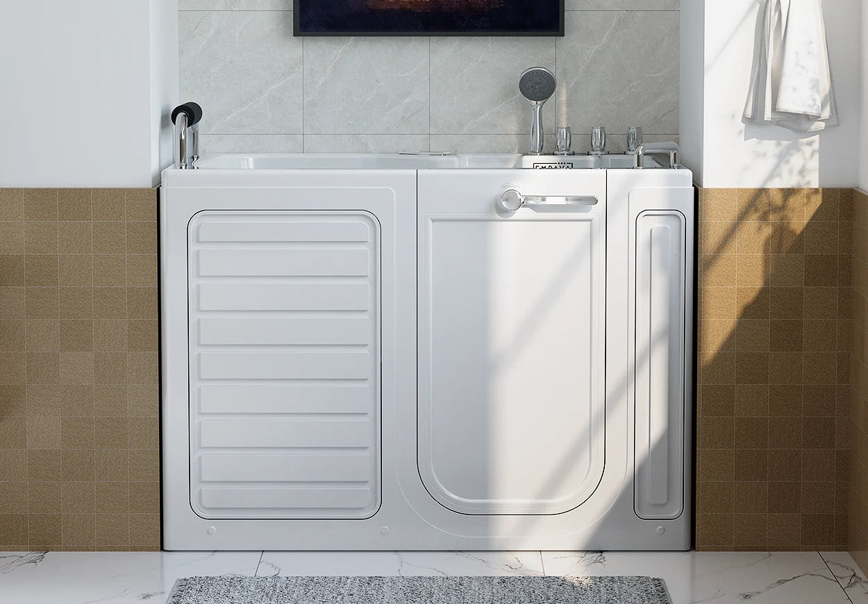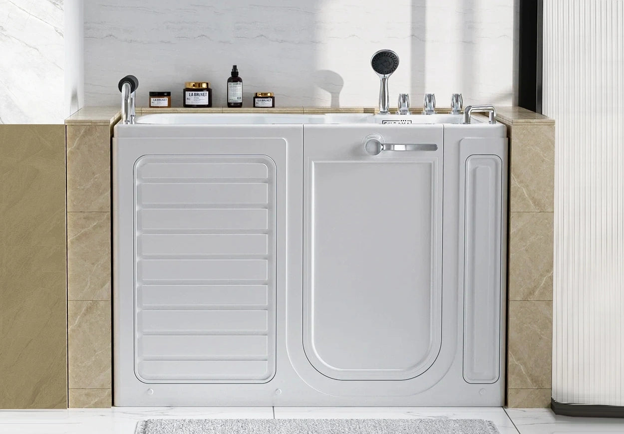 The walk-in bathtub is equipped with a low threshold, slip-resistant floor, and two strategically placed grab bars to enhance stability and reduce the risk of falls. The outward-opening door prevents accidental openings during bathing.