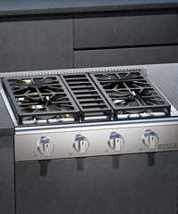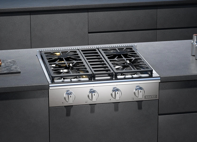 - 30 in. Gas Cooktop offers 18000-BTU, 15000-BTU, and 12000-BTU power.