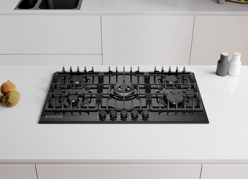 - 36" Gas Cooktop offers 13000-BTU, 10200-BTU, 6000-BTU, and 3800-BTU power.