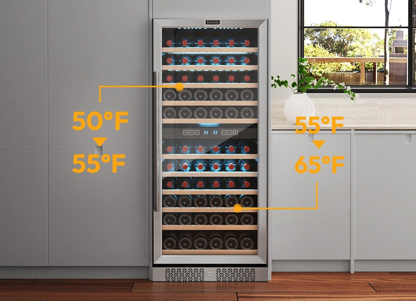 It allows for targeted storage for red wines at 55~65℉ and white wines at 50~55℉ in two individual zones.
